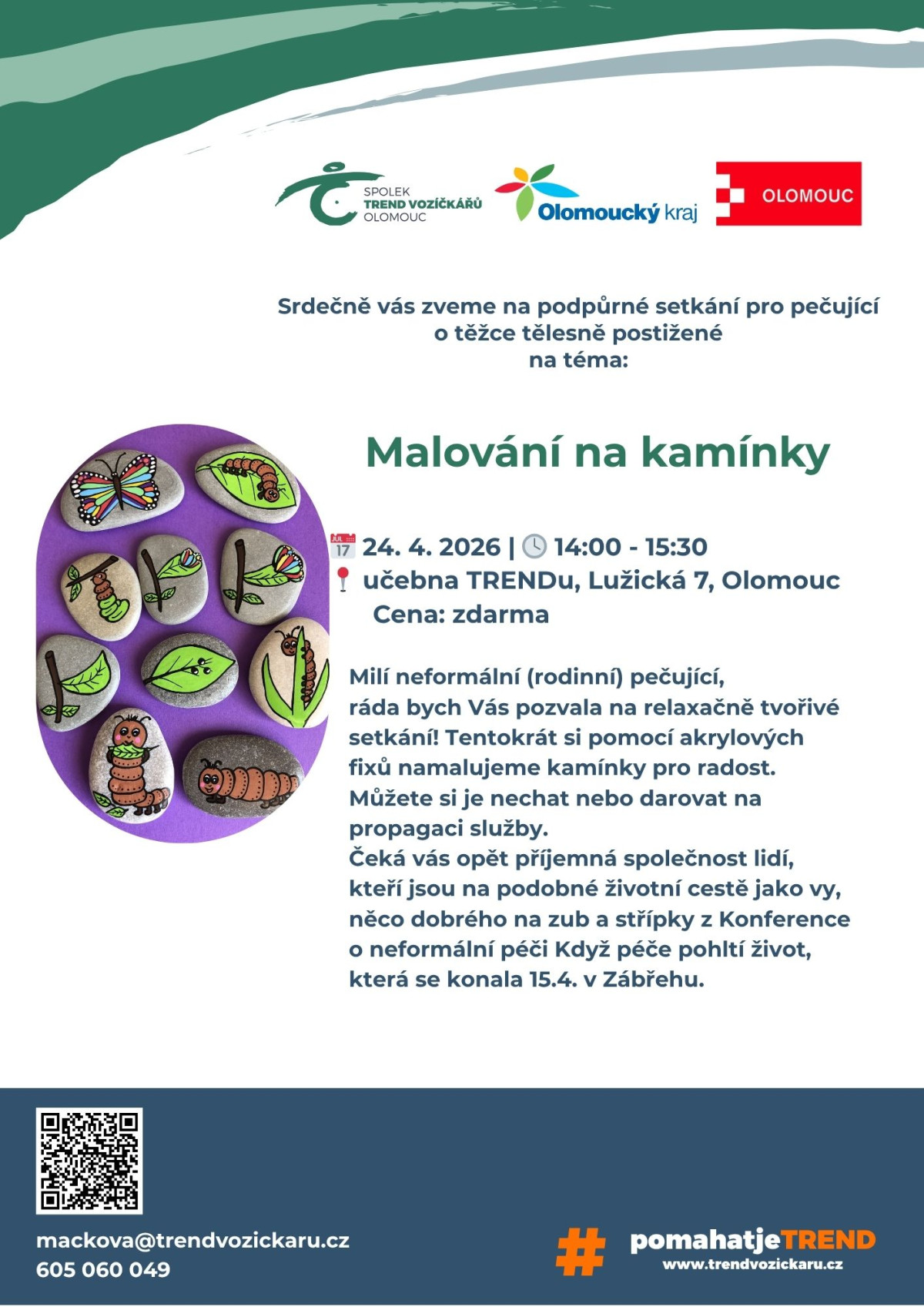 Opět zveme na Podpůrné setkání pro neformálně pečující o těžce tělesně postižené k nám do Spolku Trend vozíčkářů Olomouc. Tentokrát budeme malovat na kamínky. Přijďte si k nám odpočinout!