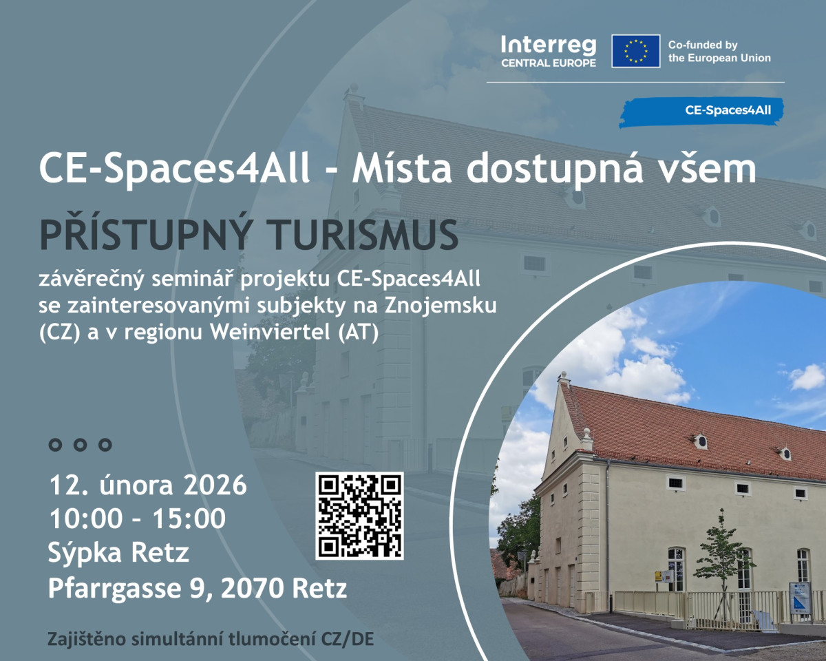 Jak může cestovní ruch fungovat tak, aby byl skutečně otevřený všem? Odpovědi nabídne závěrečný seminář mezinárodního projektu CE-Spaces4All, který se uskuteční 12. února 2026 od 10:00 ve Schüttkasten v rakouském Retzu. Akce propojí odborníky, zástupce měst, turistických organizací i podnikatele ze Znojemska a regionu Weinviertel.