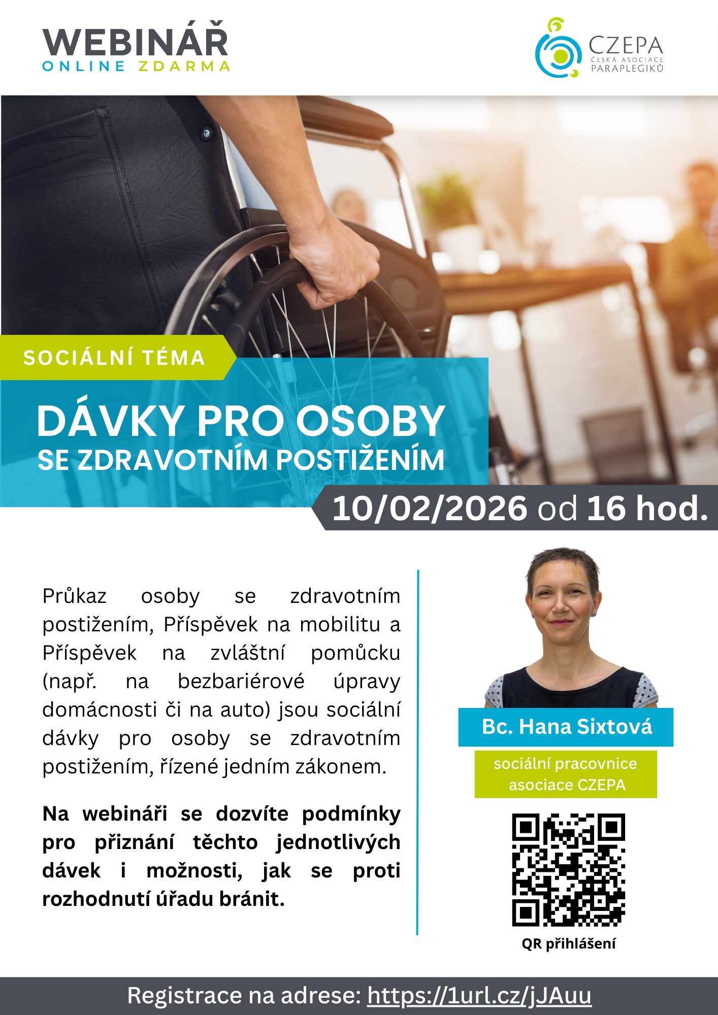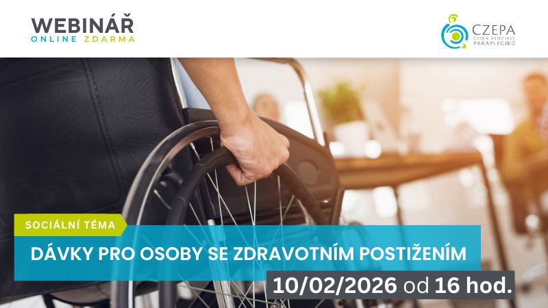 CZEPA Vás srdečně zve na bezplatný webinář k tématu podpory lidí po poranění míchy. Webinář s názvem "Dávky pro osoby se zdravotním postižením" bude vysílán v úterý dne 10. února 2026 od 16 hodin. Autorkou webináře je Hana Sixtová, sociální pracovnice CZEPA.