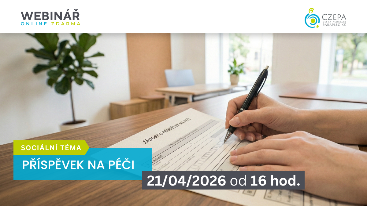CZEPA zve na bezplatný webinář k tématu podpory lidí po poranění míchy. Webinář s názvem "Příspěvek na péči" bude vysílán v úterý dne 21. 4. 2026 od 16 hodin. Autorka webináře je Bc. Hana Sixtová, sociální pracovnice CZEPA.
