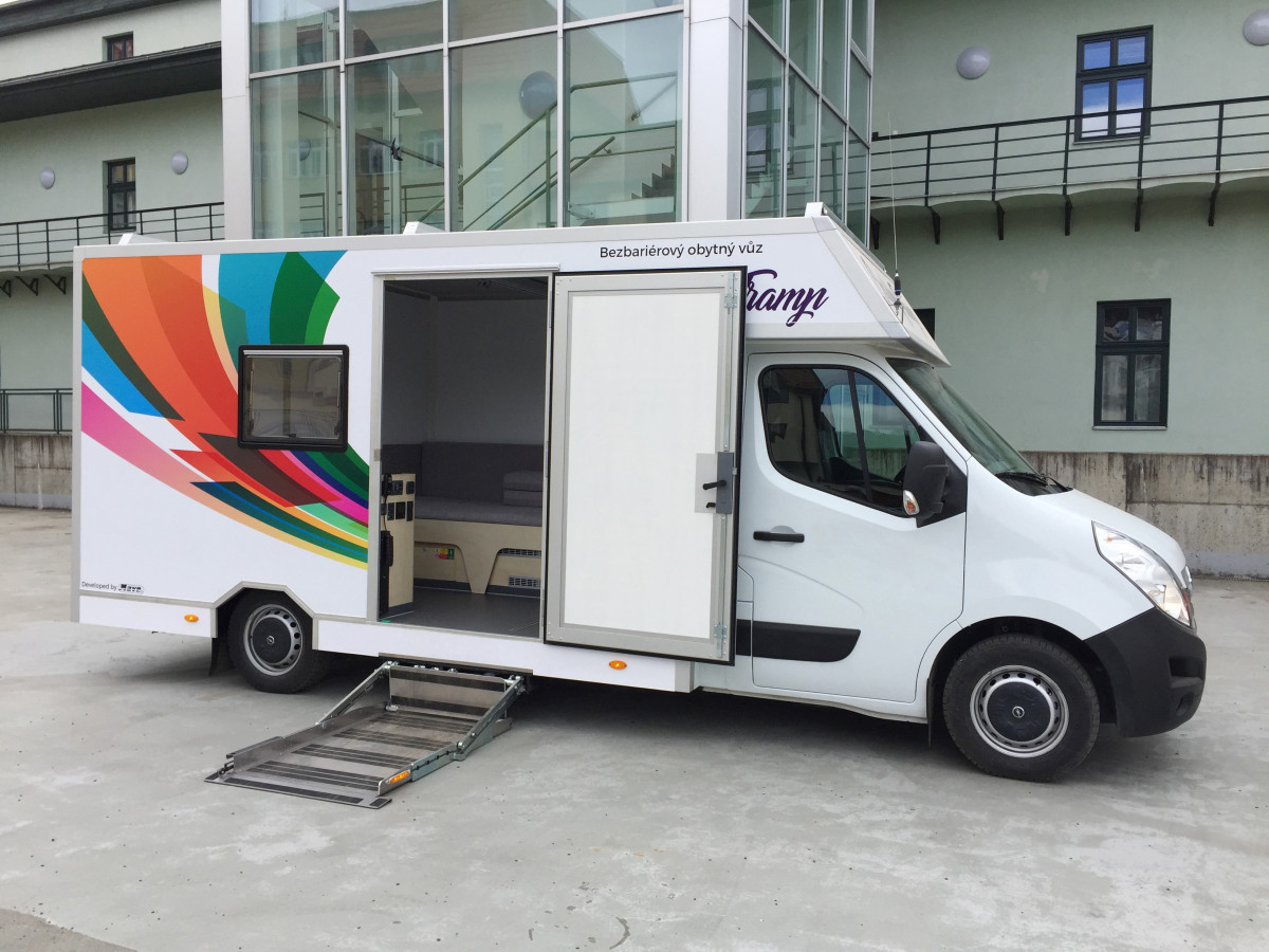 pro 4 osoby, vč. 1 vozíčkáře, stropní závěsné a zdvihací zařízení od místa řidiče až po velkou koupelnu, ruční řízení