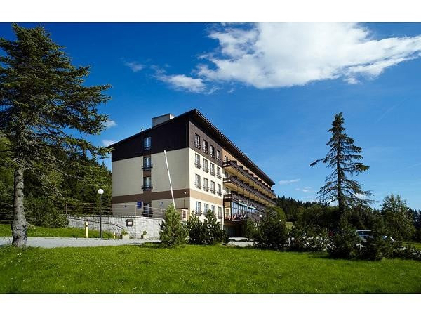 Vstup do hotelu je zastřešený a po prvních manuálních plastových dveřích následují dveře automatické. Pohyb po objektu je plně bezbariérový kromě vstupu na letní terasu. Restaurace nemá bezbariérovou toaletu, ale je na stejném patře jako bezbariérový pokoj. Pokoj je velmi prostorný včetně velké a dobře řešené koupelny. Dveře jsou opatřeny madly. Wellness centrum je bezbariérové v 800 m vzdáleném Hotelu Horizont včetně bazénu. Ve SKI Areálu Špičák je k zapůjčení biski včetně možnosti instruktora. ![]()