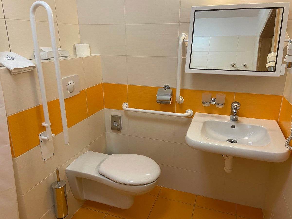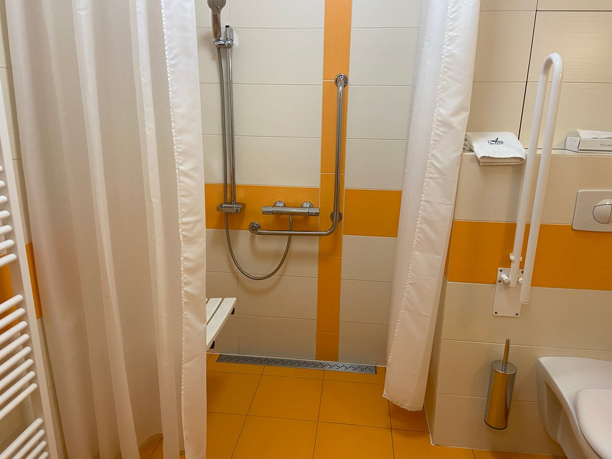 Bezbariérový pokoj Hotelu Arban je prostorný, sprchový kout má sklopnou sprchovou sedačku, je oddělen závěsem, vyspádovaná podlaha, madlo do tvaru L, WC má jedno sklopné madlo vpravo, vlevo vodorovné i svislé madlo.![]()