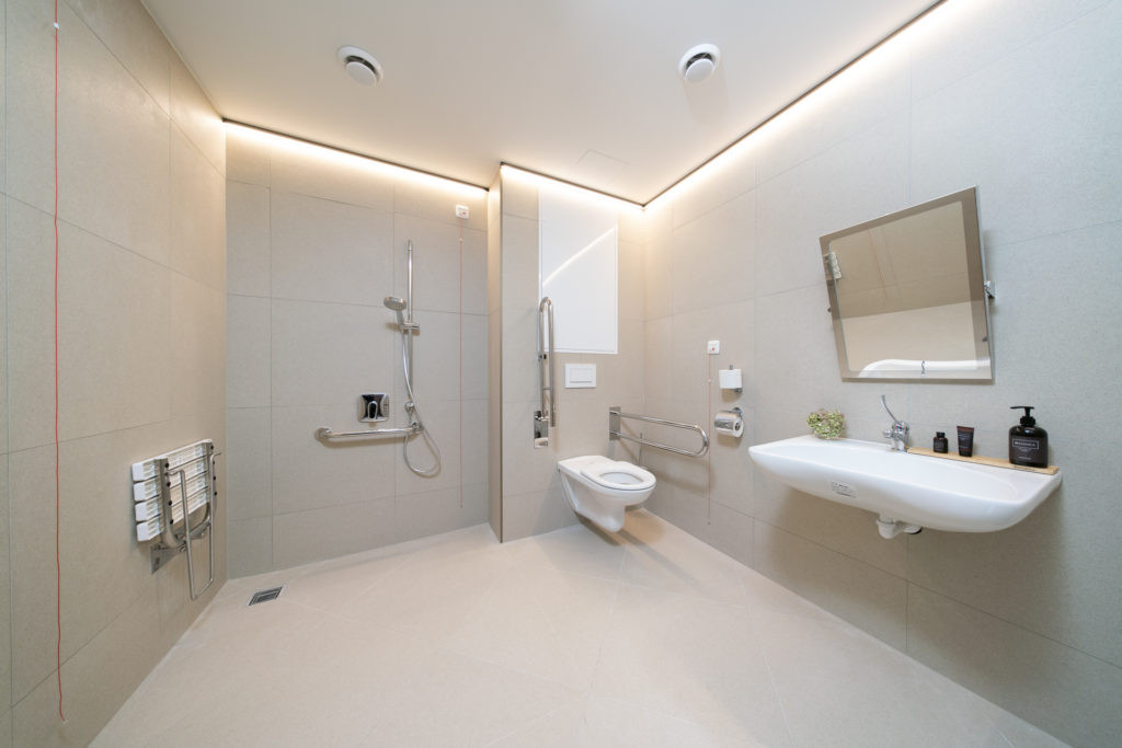 K dispozici je speciálně vybavený pokoj pro vozíčkáře s velkou přizpůsobenou koupelnou. Sprchový kout je vyspádovaný, opatřen madlem a sprchovou sedačkou, WC se dvěma sklopnými madly, umyvadlo se sklopným zrcadlem. ![]()