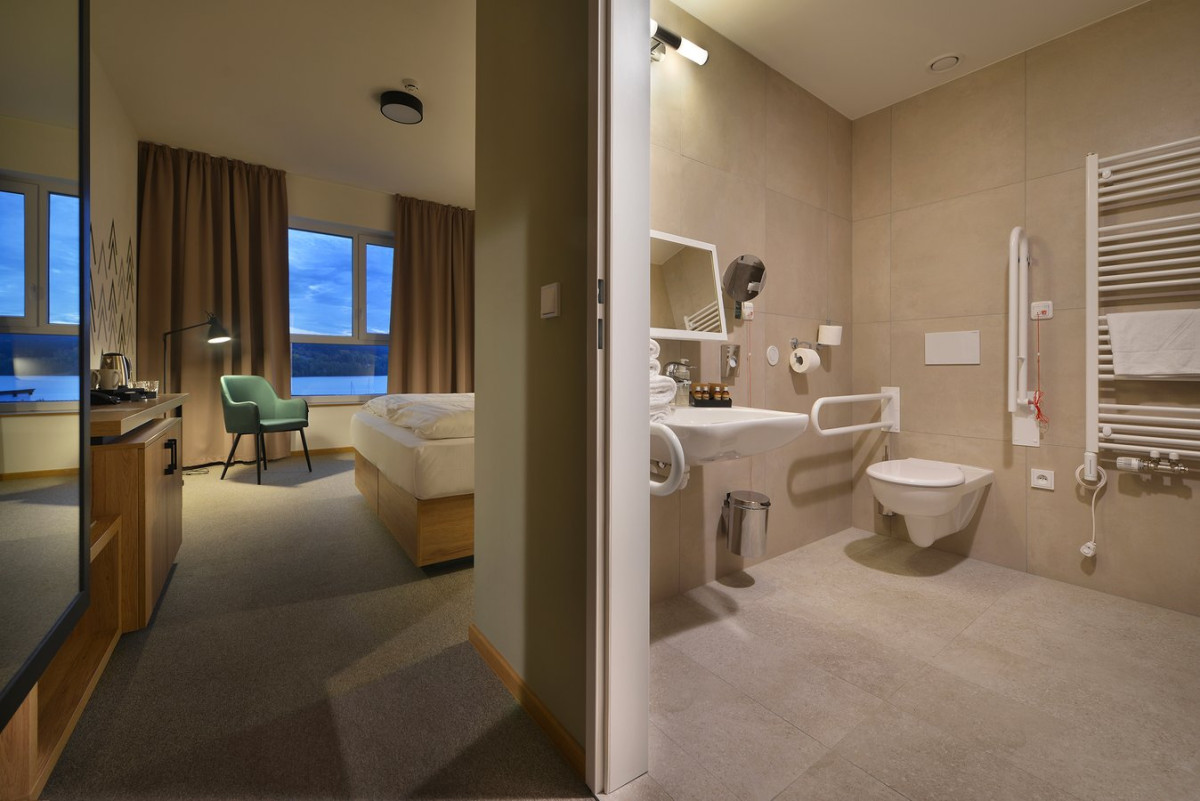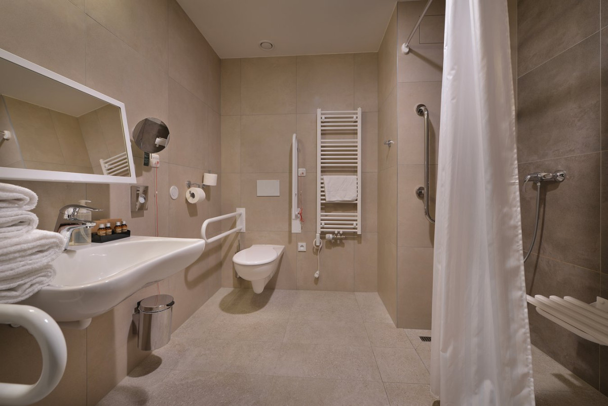 Koupelna v bezbariérovém pokoji je vyspádovaná směrem ke sprchovému koutu, ve kterém je sklopná sedačka, madlo vodorovné i svislé. WC má dvě sklopná madla, sklopné zrcadlo a madlo i u umyvadla. ![]()