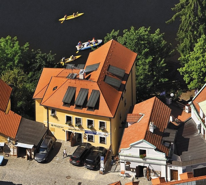 e terasovitý dům představuje typického reprezentanta staveb budovaných ve vysokých skalnatých březích nad Vltavou. Kromě úžasného výhledu na řeku a město zapsané do seznamu památek UNESCO nabízí hotel příjemné zastřešené venkovní posezení. Hosté mají k dispozici dokonalý informační servis, vzít s sebou svého domácího mazlíčka. Zpoplatněné parkoviště se nachází jednak před hotelem, jednak v uzamykatelném dvoře s tím, že místo je nutné předem rezervovat.