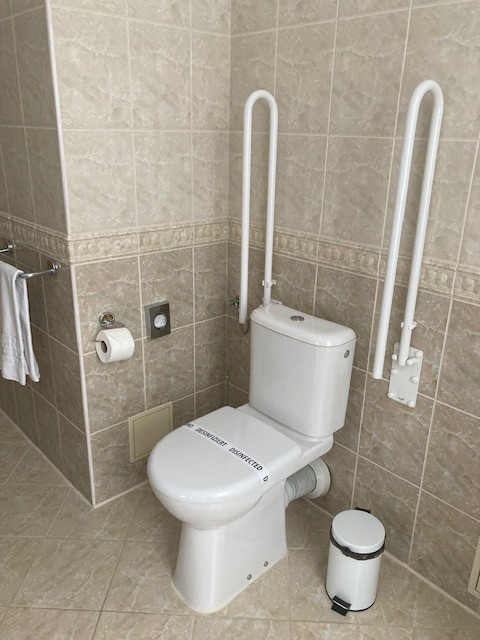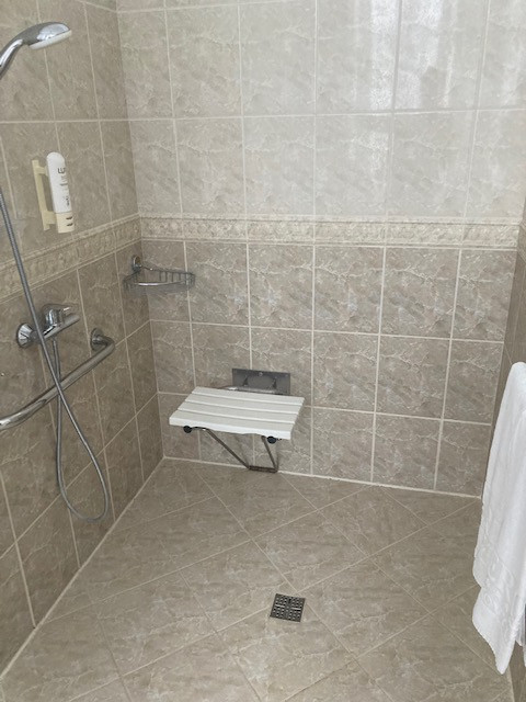 Pro návštěvu procedur na vozíku je třeba vlastní asistence. Na hotelovém pokoji je k dispozici balkon, je třeba překonat cca 7 cm vysoký práh, koupelna je vyspádovaná směrem do sprchového koutu, na zdi je sklopná sedačka a dvě vodorovná madla. WC má dvě sklopná madla. ![]()
