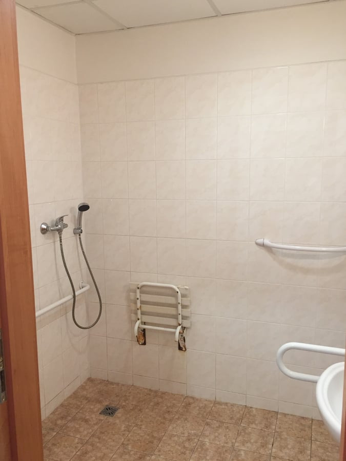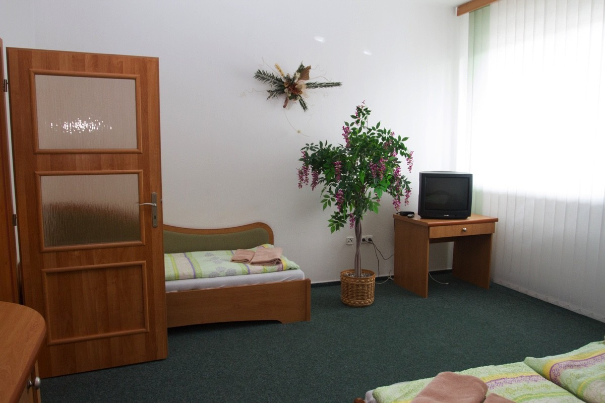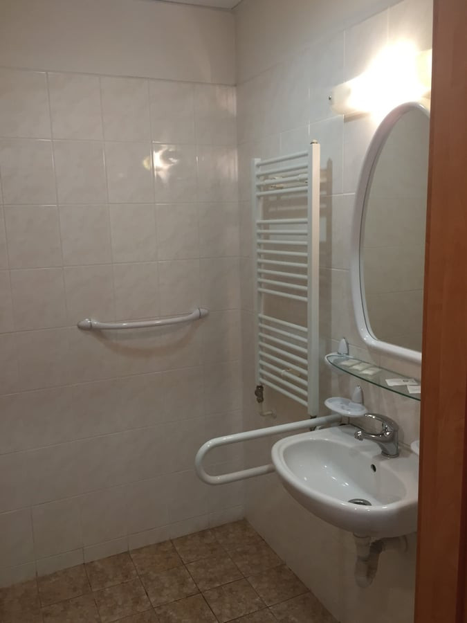 Hotel nabízí třílůžkový bezbariérový pokoj s vyvýšenou toaletou s madly a sprchovým koutem se spádovou podlahou a se sedačkou.