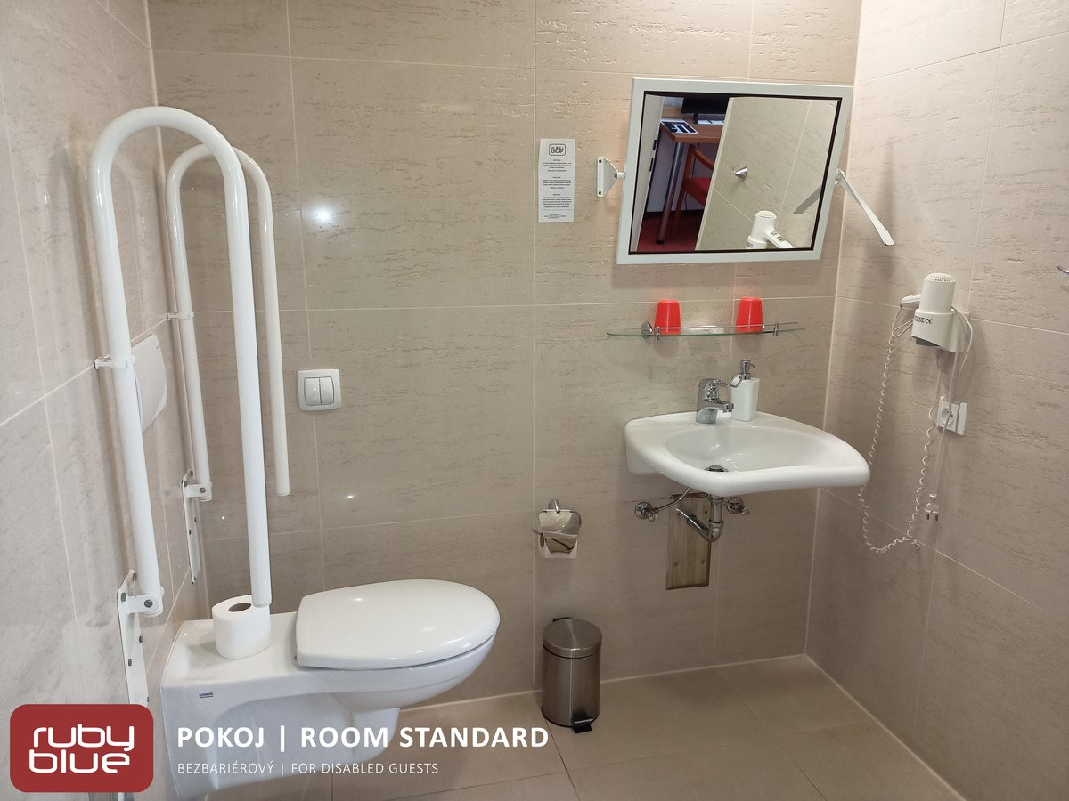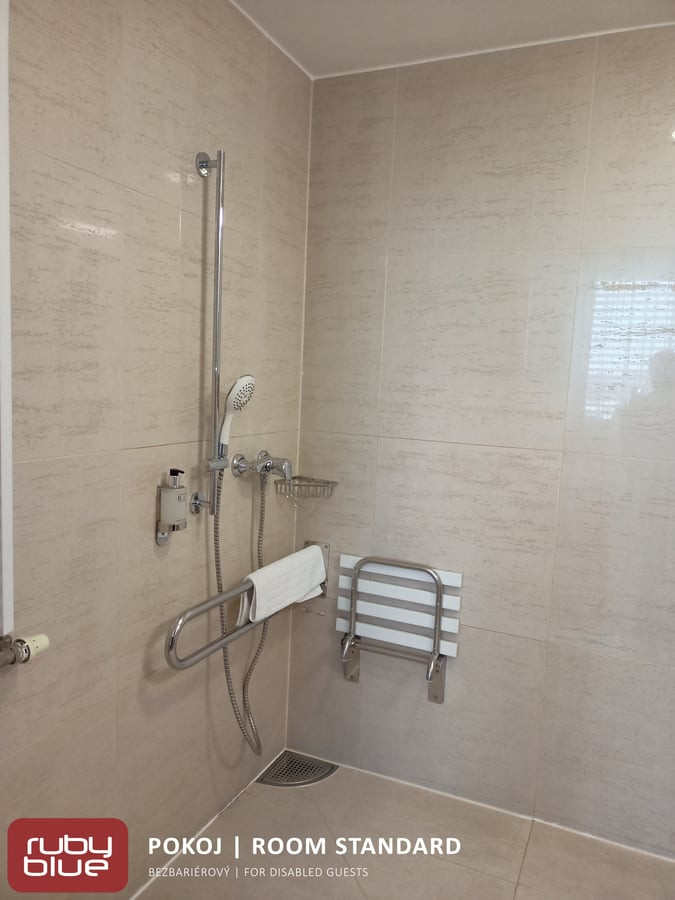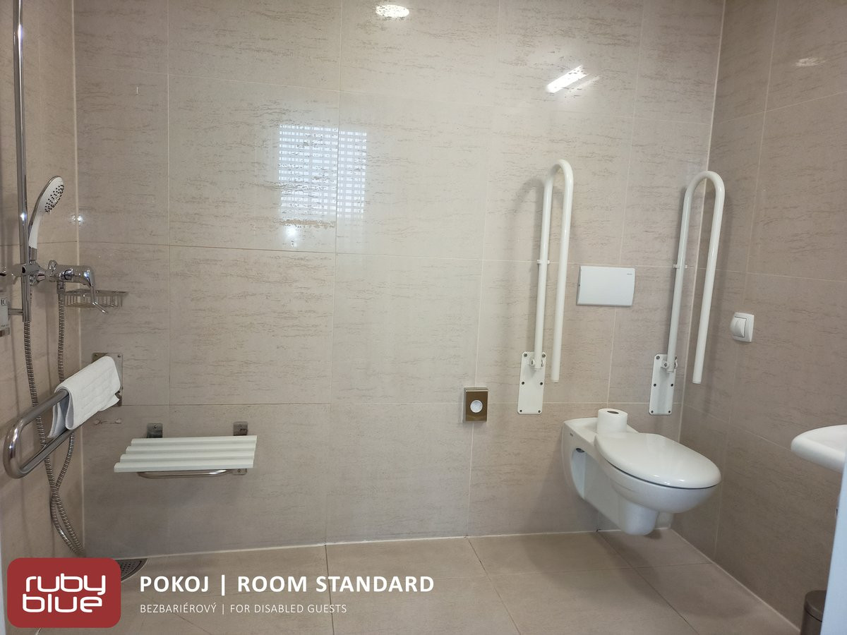 Bezbariérový hlavní vstup a veřejné toalety u recepce.Přístup do hotelu je zajištěn schodišťovou plošinou. Sprchový kout je vyspádovaný, s madlem a sprchovou sedačkou, WC má dvě madla, nad umyvadlem sklopné zrcadlo. ![]()