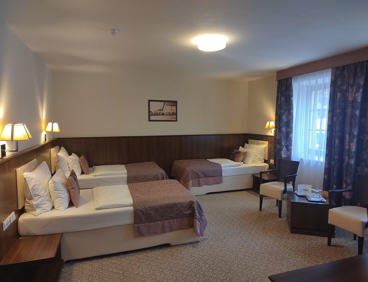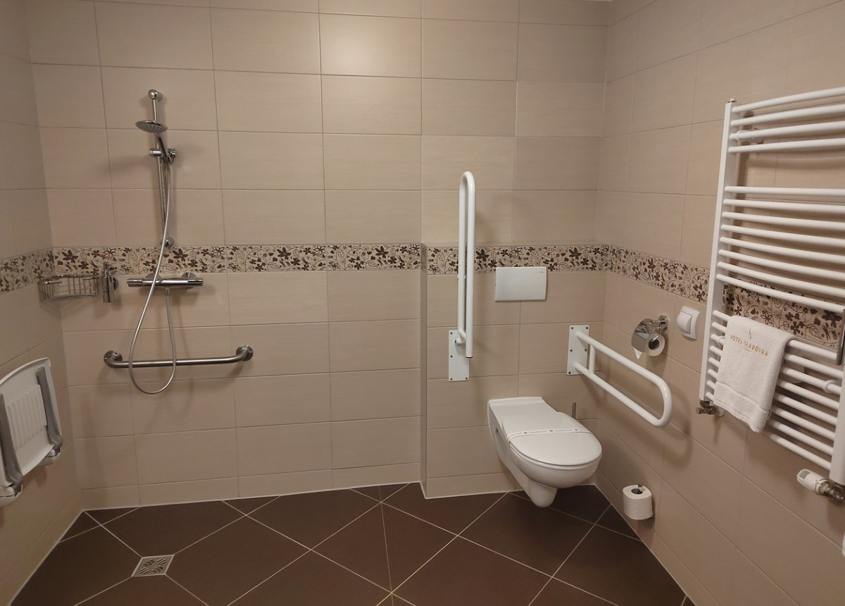 Hotel je bezbariérový, do pokoje, wellness i do restaurace je bezbariérový přístup. V hotelu je bezbariérový třílůžkový pokoj, bezbariérová koupelna má vyspádovaný sprchový kout se sklopnou sedačkou a madlem, madlo je i u umyvadla. WC má dvě sklopná madla.![]()