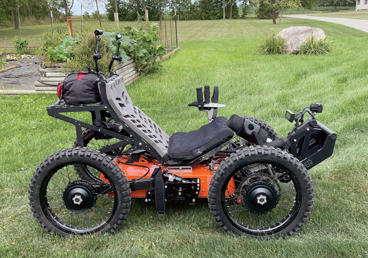Ruční ovládání je dodáváno s tříkolíkovým adaptérem, takže mohl bezpečně používat plyn a řídit. Dvě tlačítka, která umožňují kromě jiných funkcí měnit převody a rychlosti, jsou připevněna k ramenům, která jsou namontována za sedadlem řidiče. Ramena jsou nastavitelná, takže můžete tlačítka stisknout rameny nebo hlavou, aniž byste museli sundat ruce z ručních ovladačů. Sedadlo je pak nastavitelné podle výšky a délky paží – a úhel opěradla je nastavitelný pro dostatečné pohodlí a potřebnou rovnováhu.