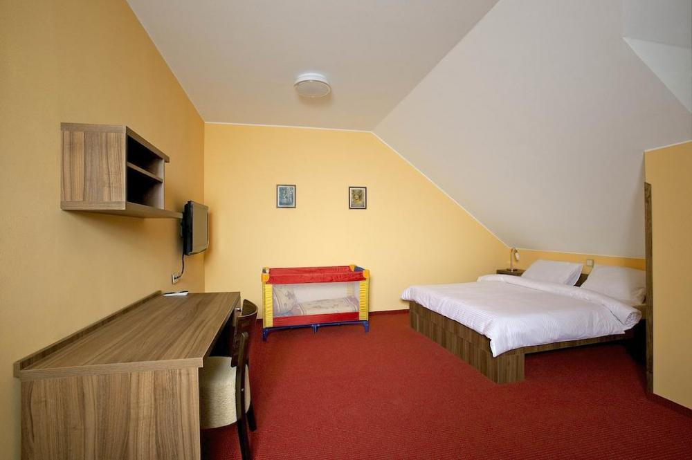 Bezbariérový pokoj se nachází v prvním patře penzionu, kam Vás vyveze výtah. Pokoj o výměře 20 m2 je vybaven LCD televizorem se satelitem, internetovým WI-FI připojením, psacím stolem, skříní, nočními stolky a křesly s konferenčním stolkem. Pokoj má vlastní sociální zařízení, přizpůsobené pro bezbariérové použití s madly a širšími vjezdy. Sociální zařízení je vybaveno sprchovým koutem a toaletou. K dispozici je fén a ručníky.