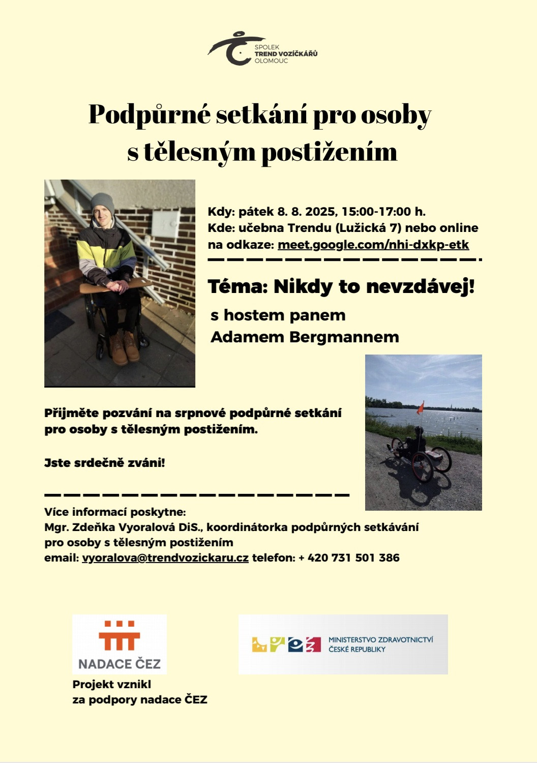 srdečně zvu na srpnové podpůrné setkání pro osoby s tělesným postižením v neziskové organizaci Spolek Trend vozíčkářů Olomouc. Setkání se uskuteční v pátek 8.8. 2025 od 15 do 17 hodin v učebně Trendu na Lužické 7 nebo online prostřednictvím odkazu v přiložené pozvánce.