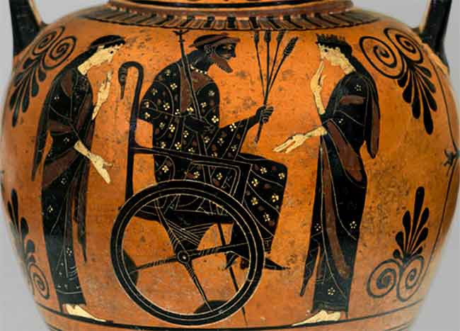 Triptolemos na vozíku evidentně rád seděl, podle tradice jej přenášelo dračí spřežení.