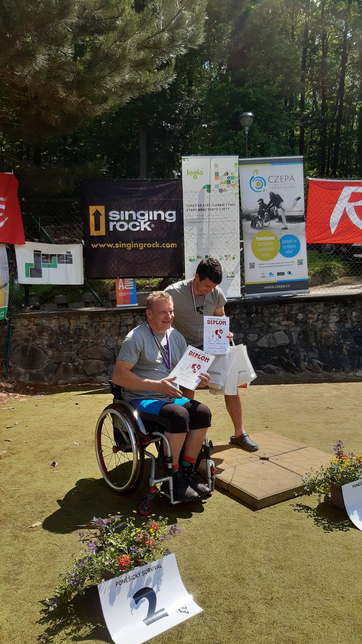 Pavel Šprynar se svým choďákem Jakubem Měrkou si tak byli v kategorii vozíčkář+chodák sami sobě soupeřem. Ale dalších 21 závodních dvojic na trati víceboje (kategorie muži+muži, ženy+ženy, mix) bojovalo spolu s Pavlem s kilometry, terénem, únavou i deštivým počasím.