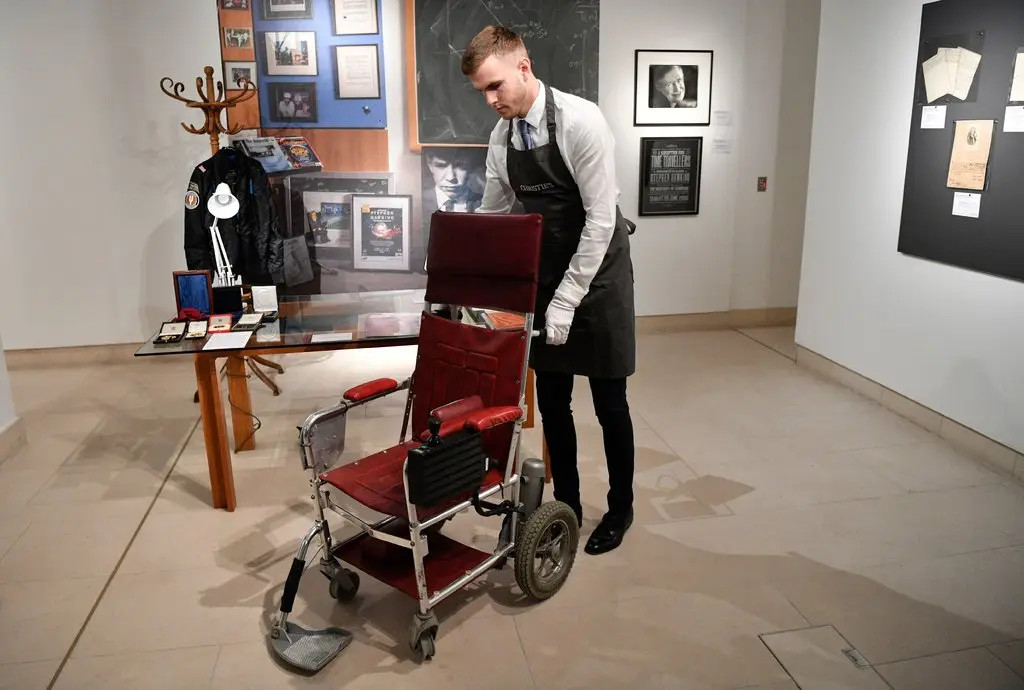 Červený invalidní motorový vozík používal britský vědec a popularizátor vědy Stephen Hawking na přelomu 80. a 90. let; přestal ho používat, když už ho nemohl řídit rukama. Fyzik byl po většinu života imobilní kvůli amyotrofické laterální skleróze neboli Lou Gehrigově chorobě postupně ztrácel kontrolu nad svaly.
