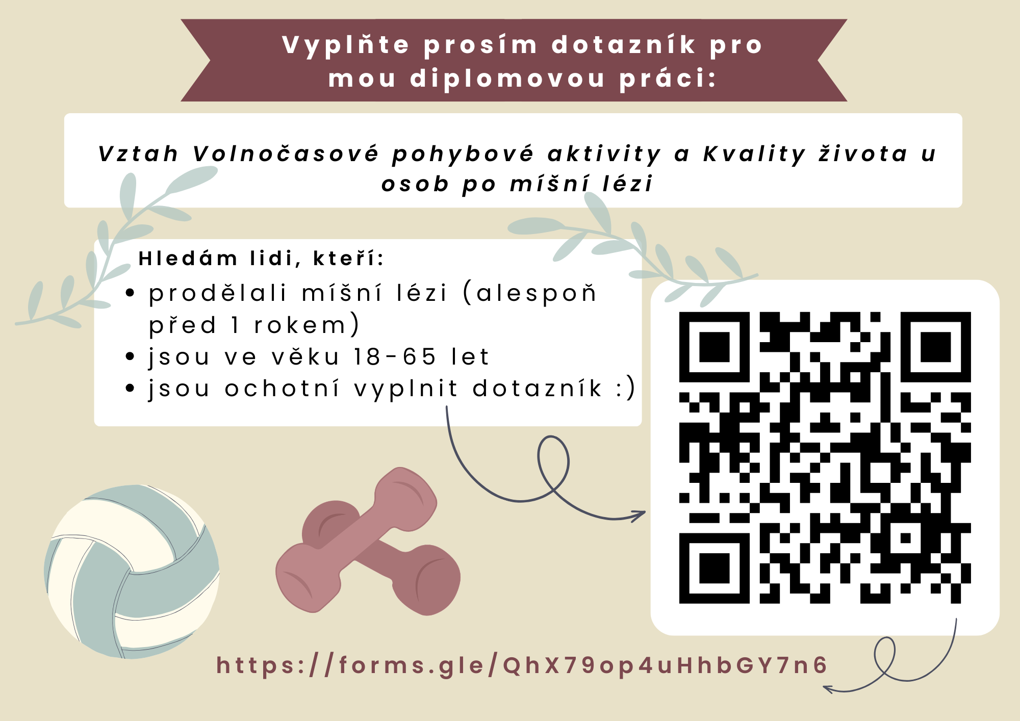 Dobrý den, jmenuji se Blanka Vandasová a jsem studentkou magisterského studia Aplikované fyzioterapie na 2. Lékařské fakultě UK. V rámci své diplomové práce zkoumám jaký je vztah mezi volnočasovou pohybovou aktivitou a kvalitou života u lidí po míšní lézi. Pokud jste vy nebo někdo vám blízký míšní lézi (před více než jedním rokem) prodělal, tak bych vás ráda poprosila o vyplnění následujícího dotazníku a/nebo jeho sdílení dále.