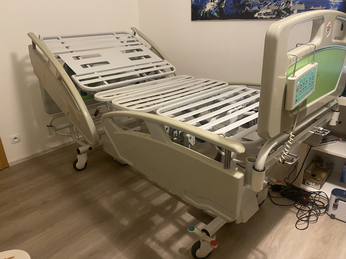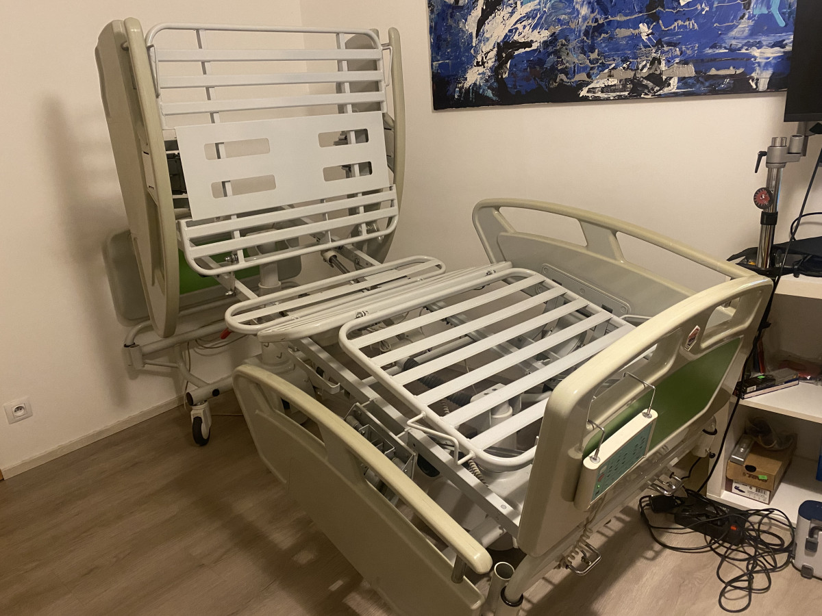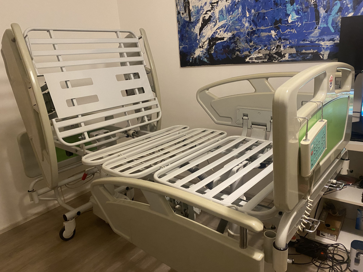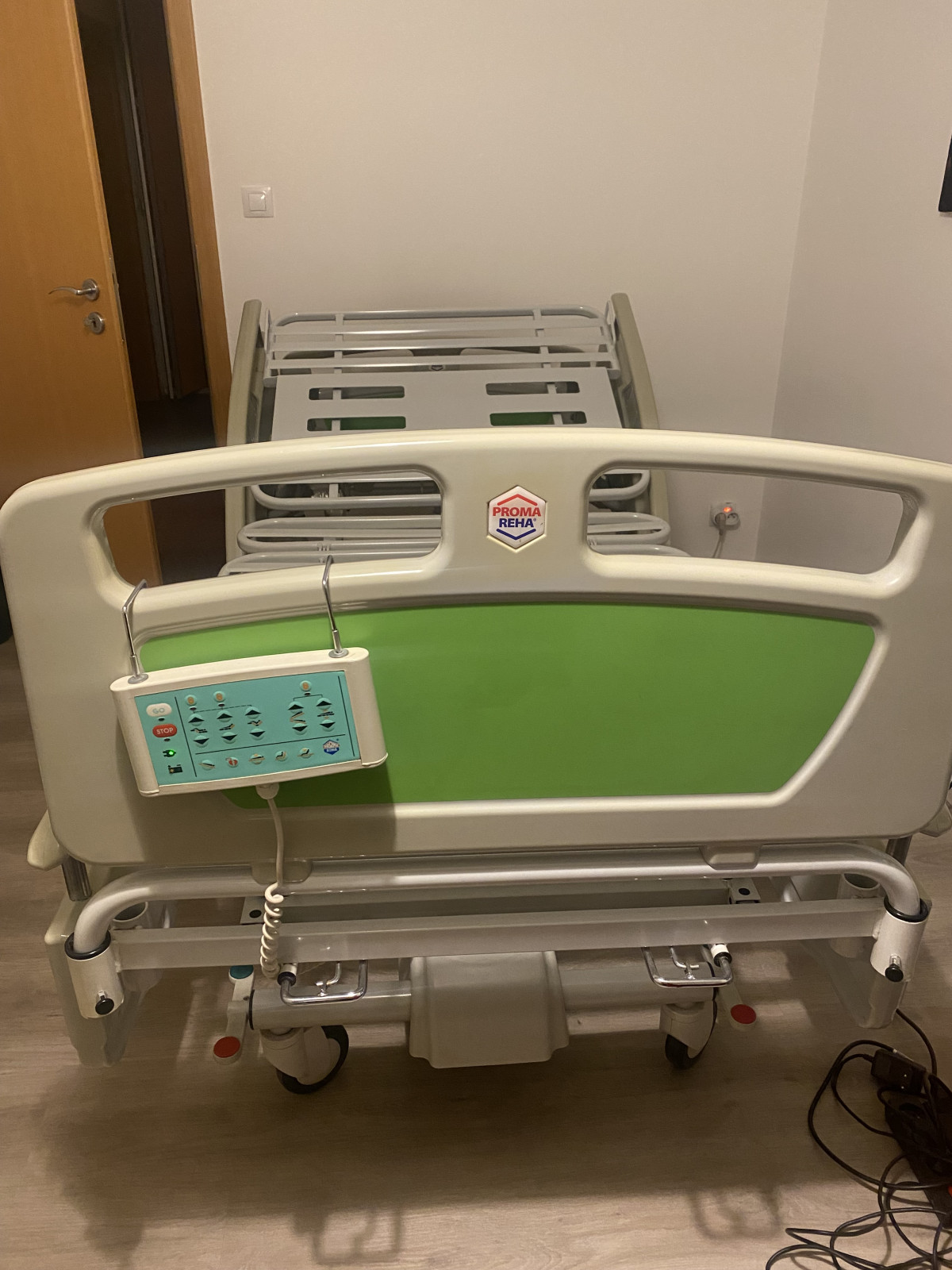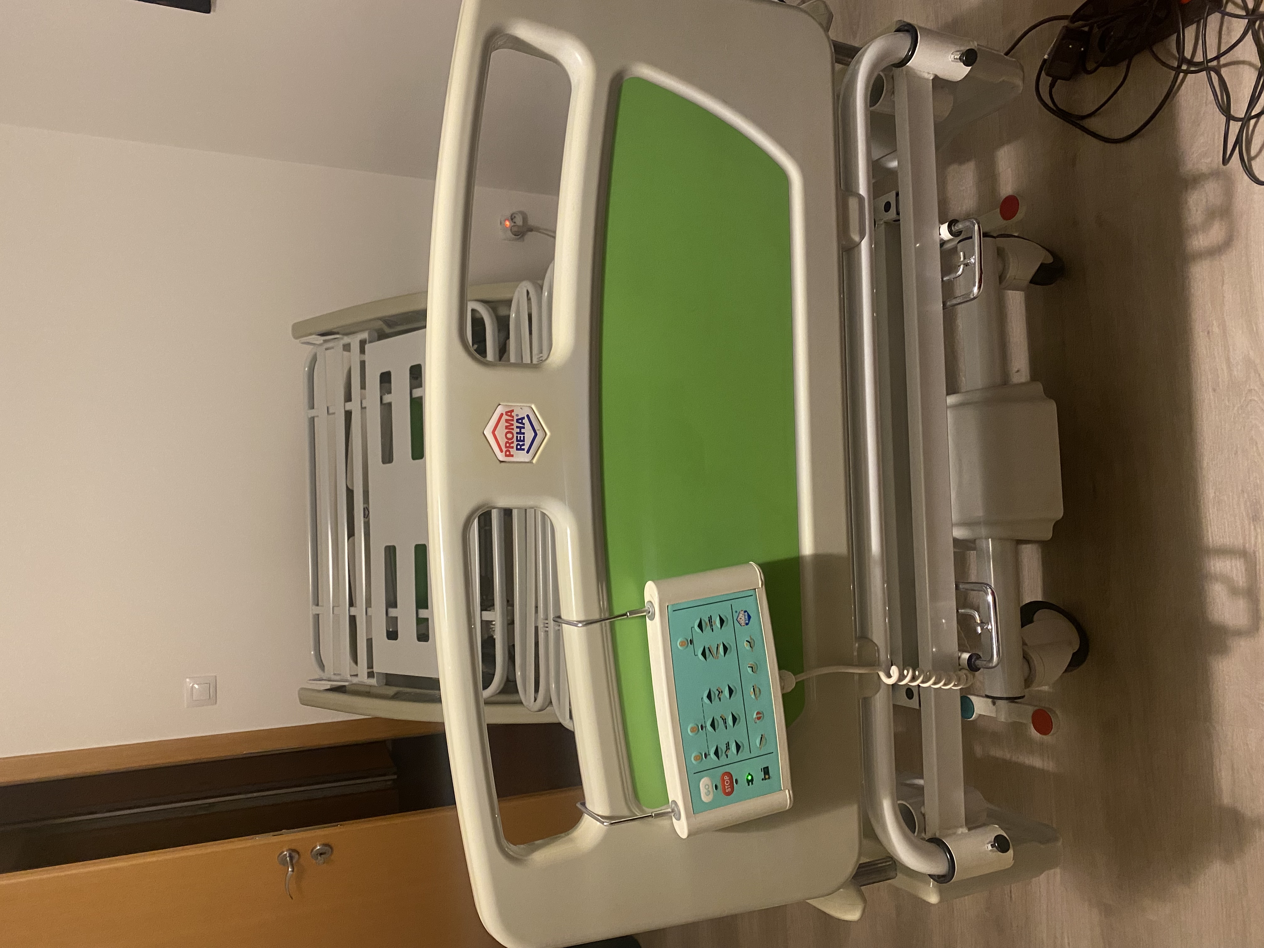 Prodám bytelnou elektrickou polohovací postel Proma Reha – polohování zad, nohou, zdvihu i celkového náklonu lůžka (hlavou nahoru i dolů). Velkou výhodou je možnost vysokého zdvihu zádové části do úplného sedu (úhel prakticky 90°), což u jiných postelí nebývá (viz foto). Postel lze prodloužit o 20 cm povytažením části lůžka u nohou. Přední i zadní čelo je vyndavací, bočnice sklápěcí, součástí je skládací kovový držák na lůžkoviny u nohou. V červenci 2025 proběhla celková revize pracovníkem servisu Proma Reha + byl vyměněn zádový díl za úplně nový. Nosnost 240 kg.