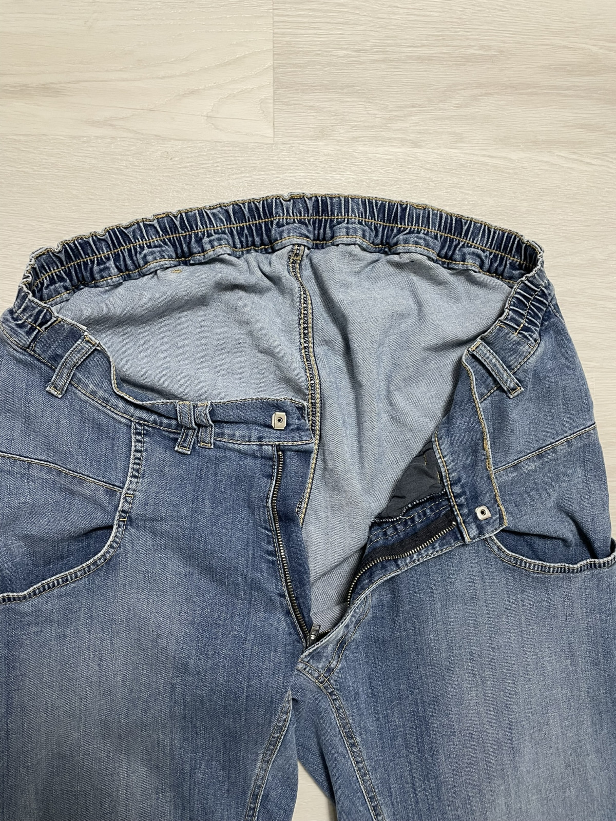Nabízím k prodeji pánské rifle velikosti L s upraveným střihem pro pohodlnější sezení na vozíku. Kalhoty mají vypracovanou zadní částí přes hýždě, zkrácenou přední částí a poutky pro jednodušší oblékání. Původně koupeny za 1500 kč. Nabízím za 700 kč.