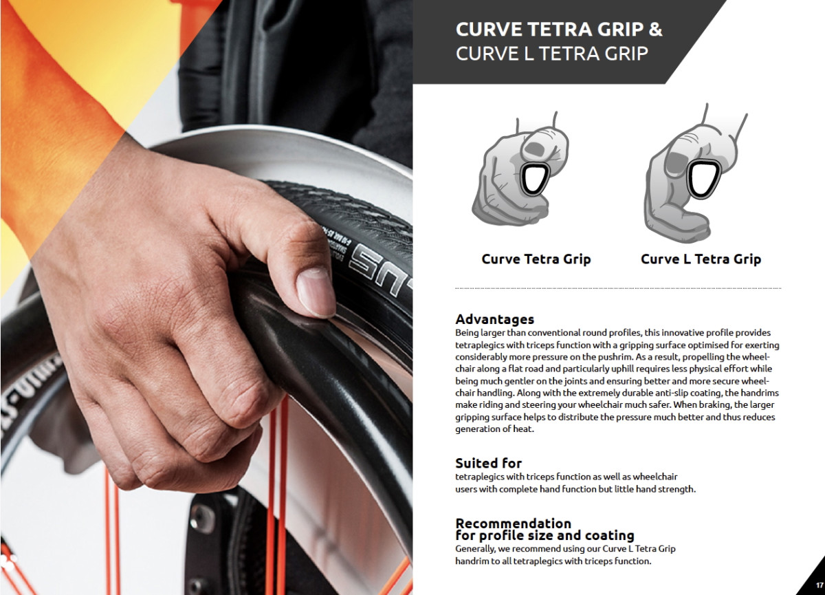 Tím, že jsou obruče většího profilu než běžné silikonové obruče, jsou ideální pro tetraplegiky se zachovanou funkčností tricepsů. Profil a větší prostor pro oblast palce umožňuje mnohem efektivněji vyvinout větší sílu do obručí. Výsledkem je, že pohon invalidního vozíku v rovinatém prostředí a zejména do kopce vyžaduje méně fyzické námahy. Obruč je také šetrnější ke kloubům ruky a zápěstí.