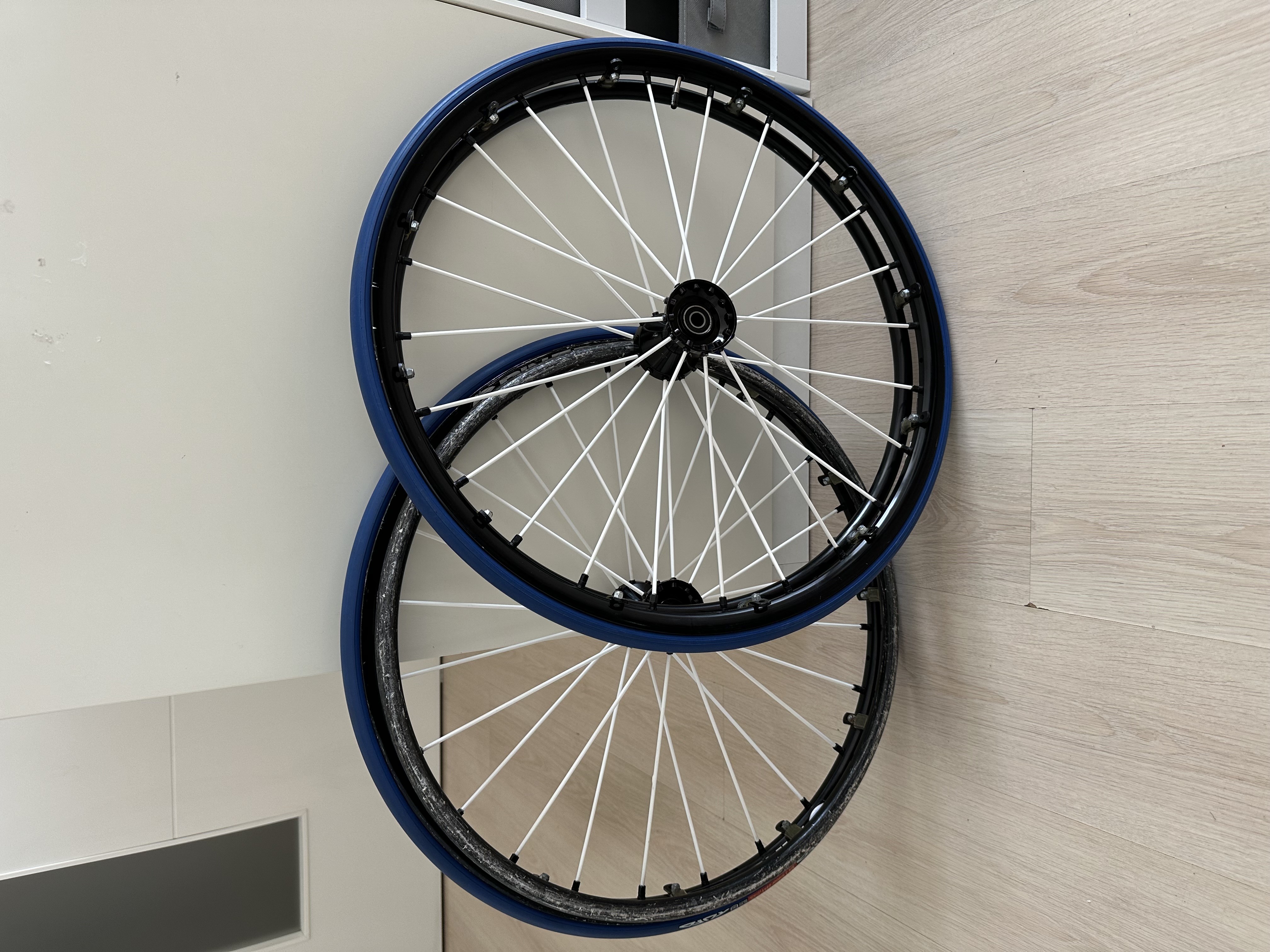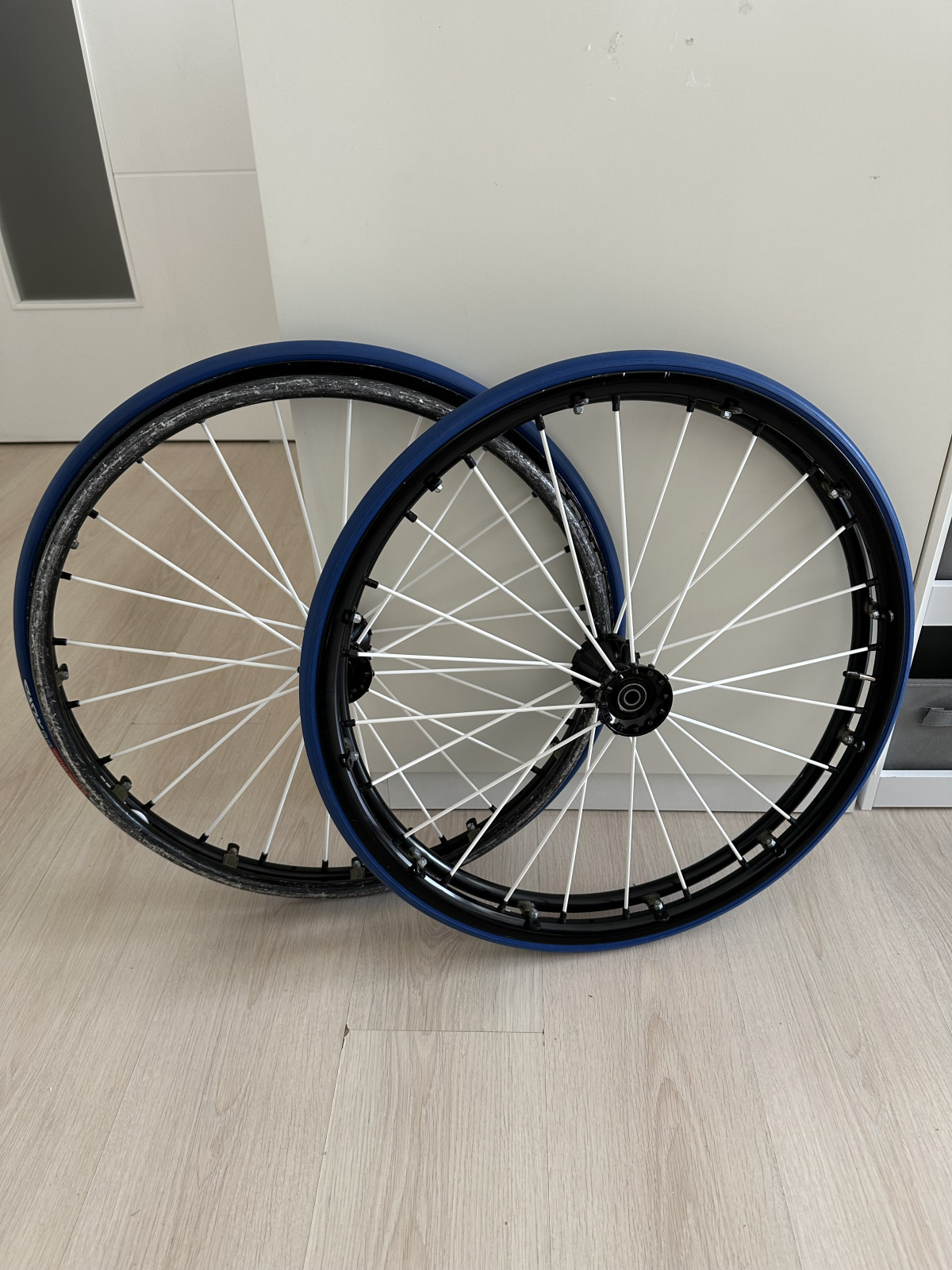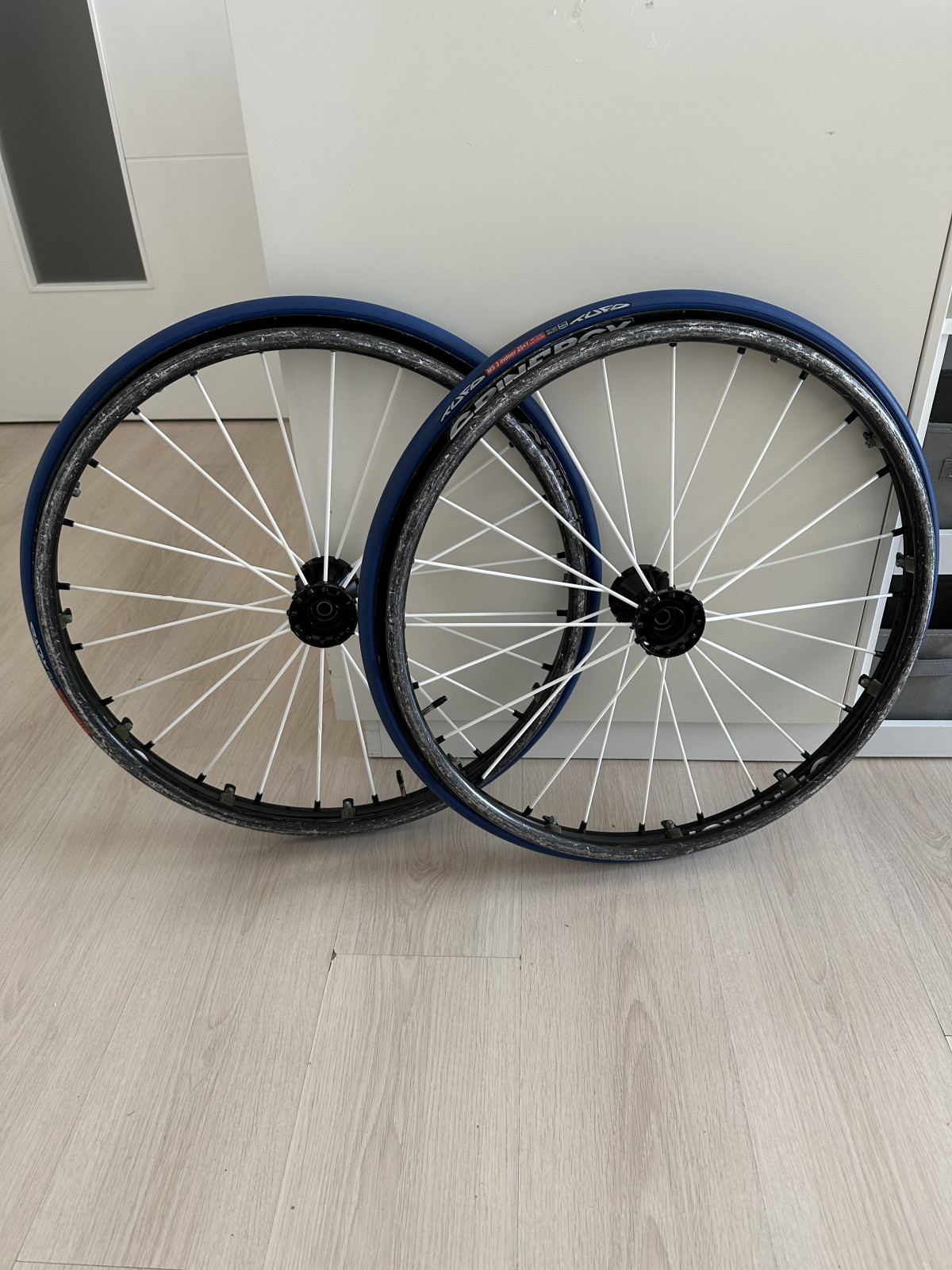 Obruče jsou dost poškrábané, viz foto. Vhodné jak na civilní vozík, tak i pro sport (obruč je uchycena 12 packami). Sloužily převážně jako rezervní, takže jsou minimálně používané. Součástí jsou nové galusky TUFO MS3.