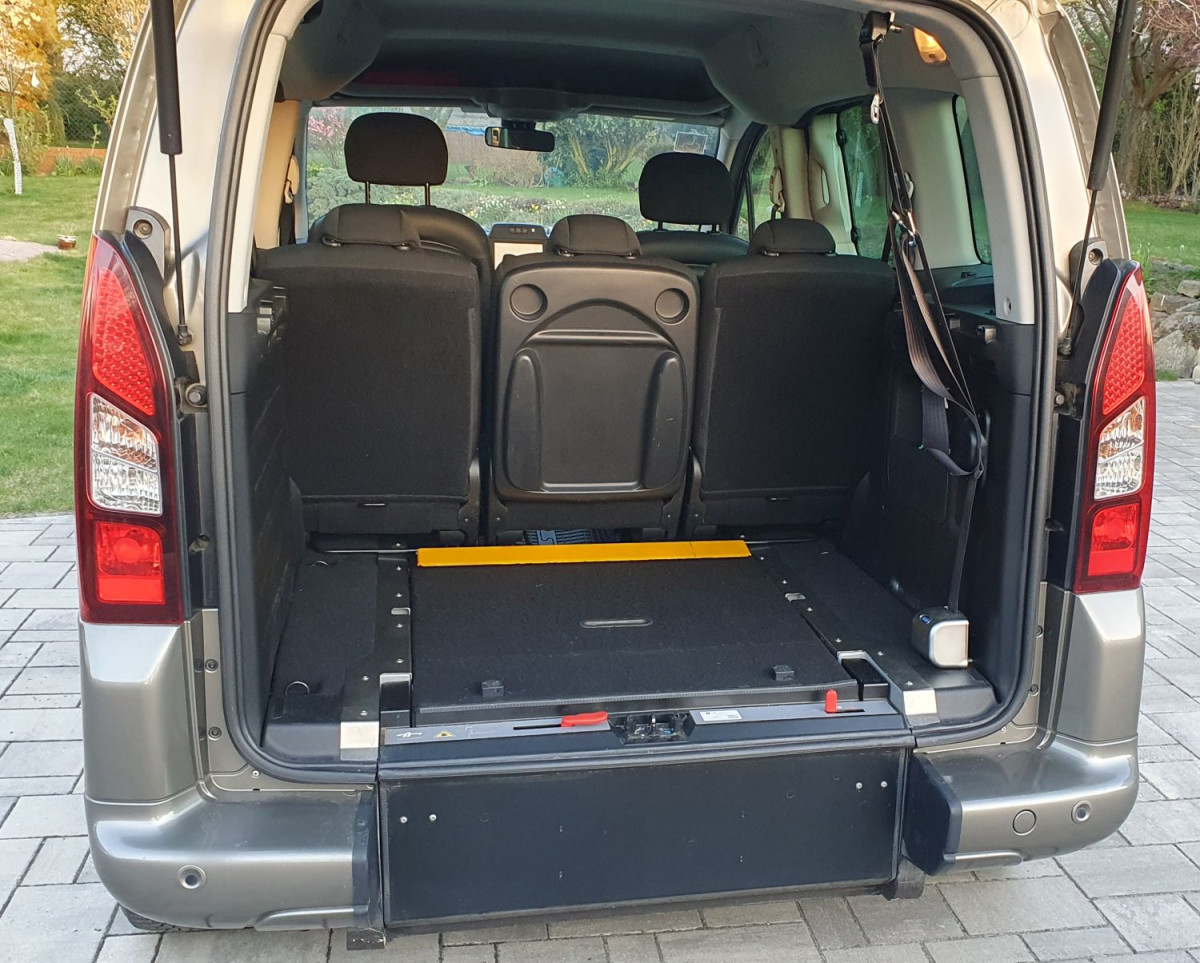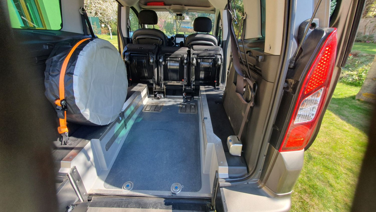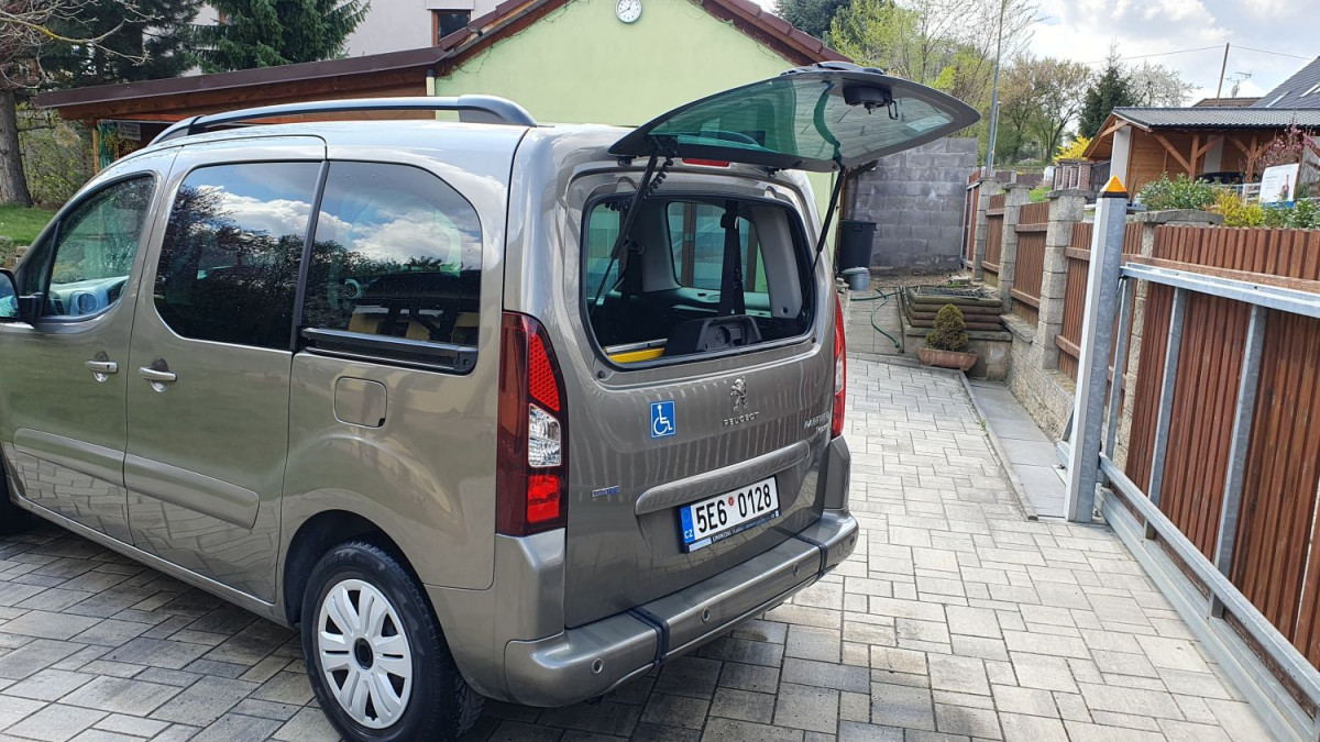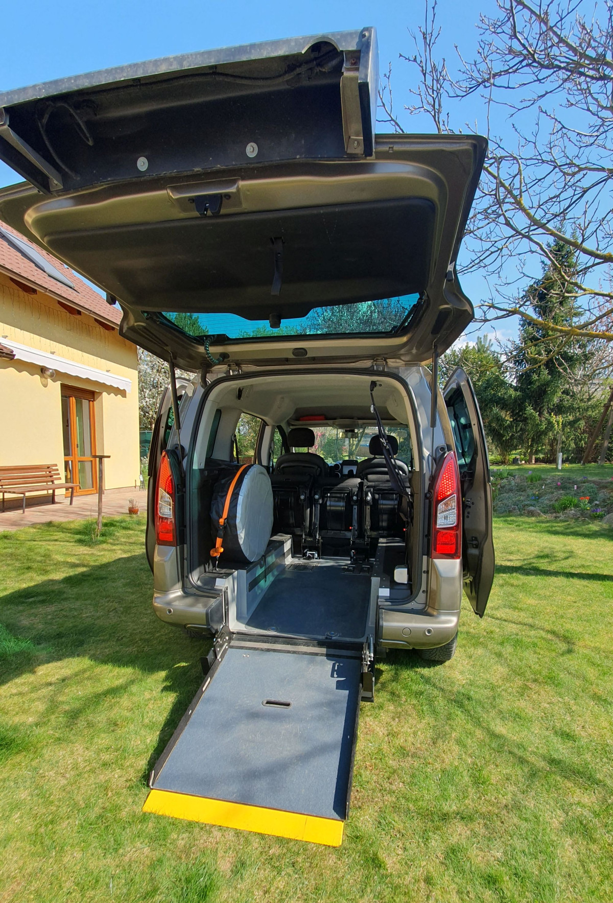 Peugeot Partner Tepee 1,6 HDI r.v. 2016, hnědozlatá metalíza, vybavený sklápěcí rampou pro převoz vozíčkáře na vozíku (homologovaná úprava od firmy API CZ) včetně bezpečnostních pásů a uchycení vozíku. Auto je možné používat i jako běžné pětimístné vozidlo. Zadní sedadla lze jednotlivě vyjmout.