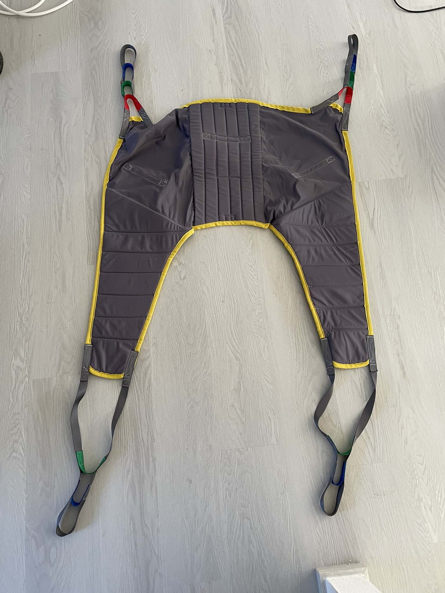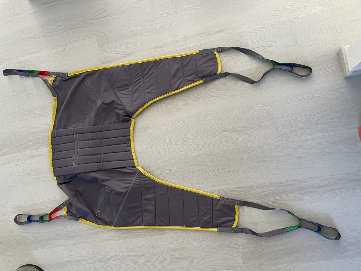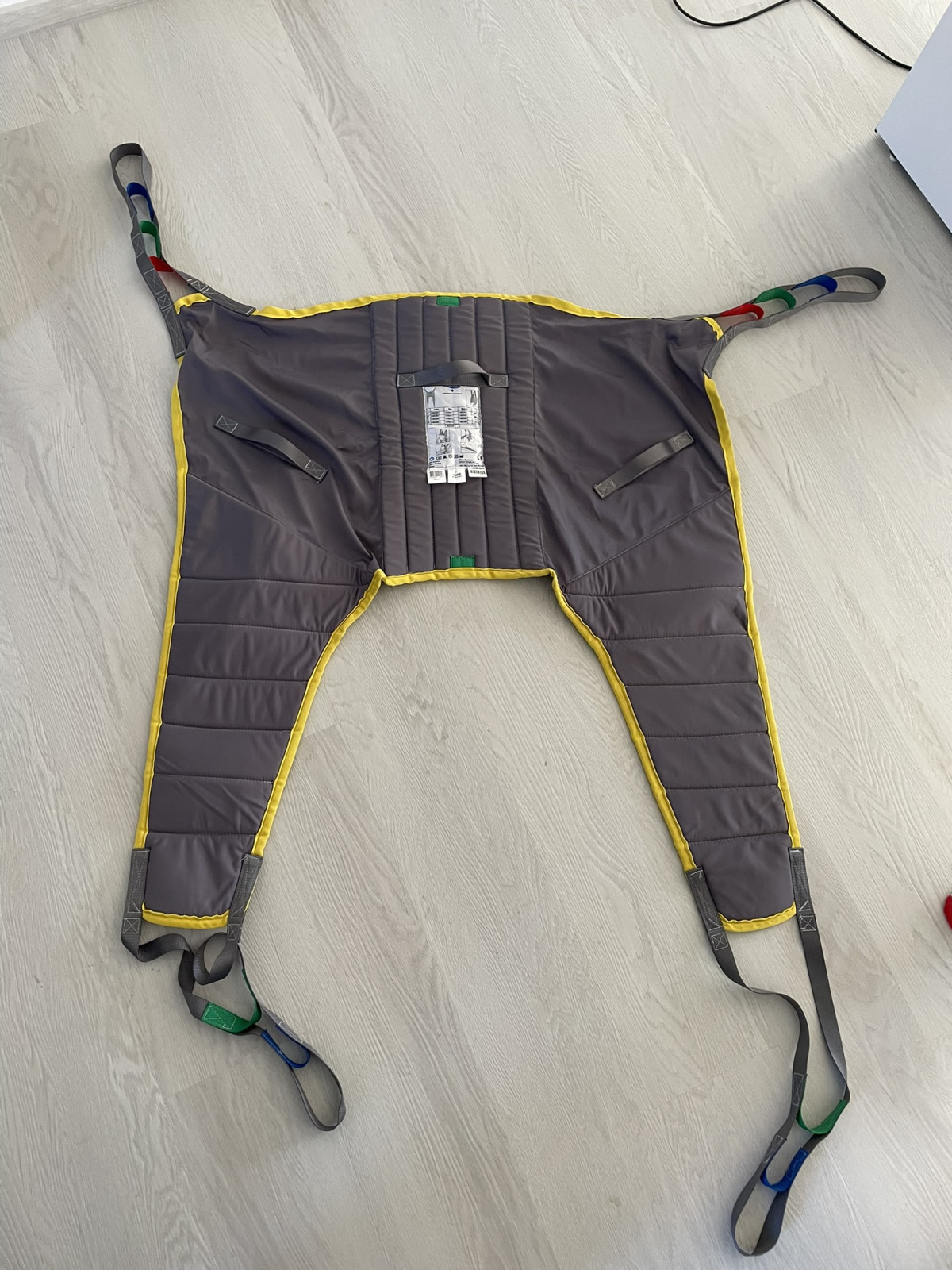 Nosnost 200 kg, jako nový, minimálně použitý. Barevně značená pevná oka, polstrovaná. Vhodná pro běžné pacientské zvedáky.